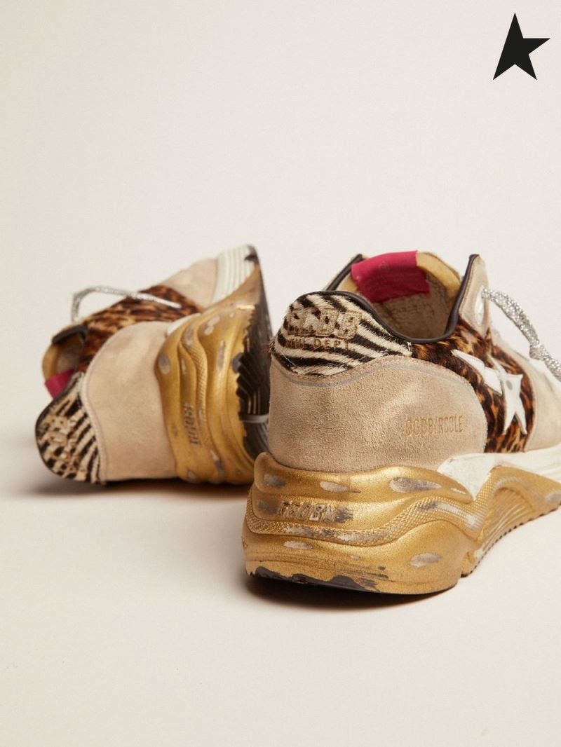 الأوزة الذهبية الوحيدة المحدودة أحذية رياضية في ليوبارد طباعة المهر جلد الغزال مع إدراج شبكة النمر الأبيض