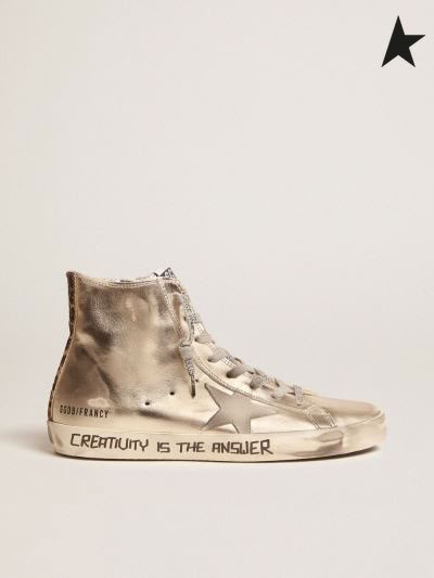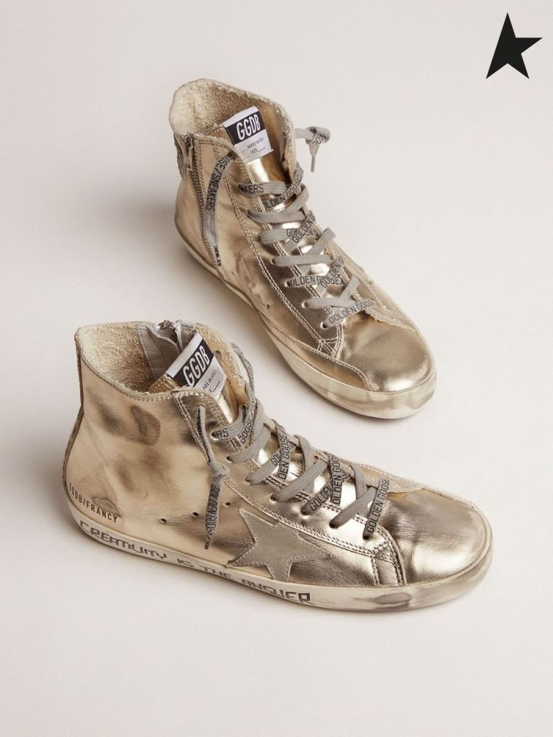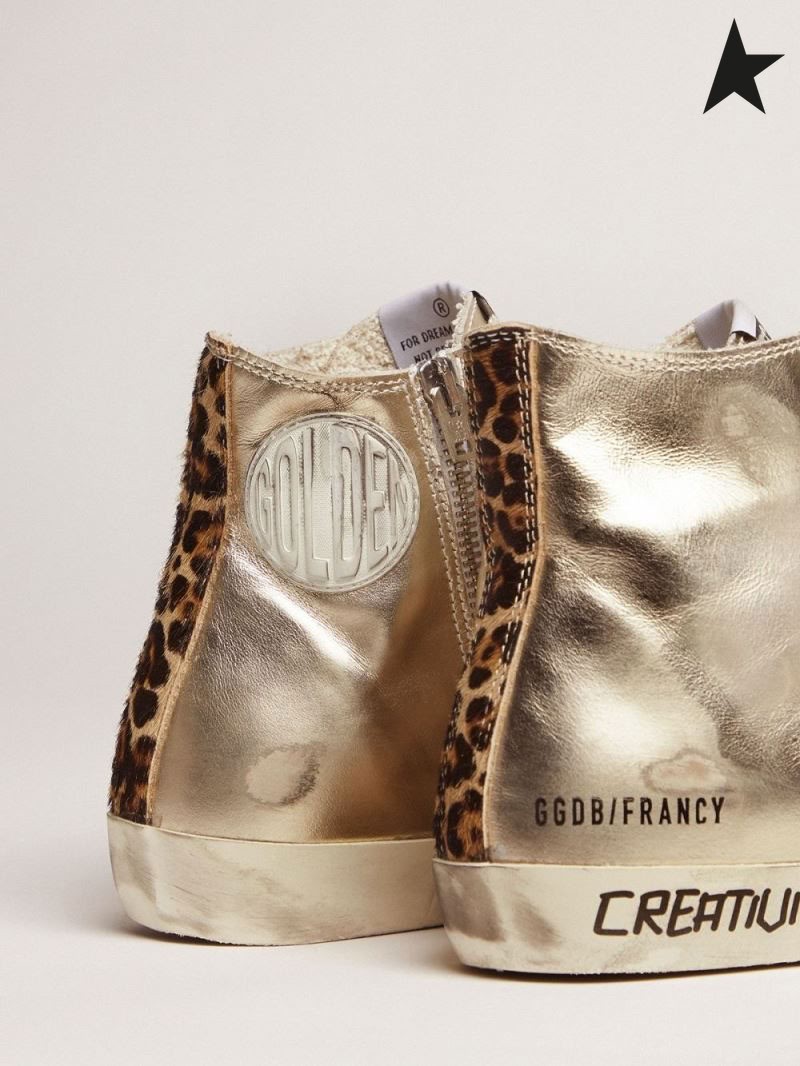 أوزة ذهبية الذهب هكذا أشارت فرانسي أحذية رياضية مع الحروف المكتوبة بخط اليد و ليوبارد طباعة تفاصيل ذهبية اللون الرمادي الفهد
