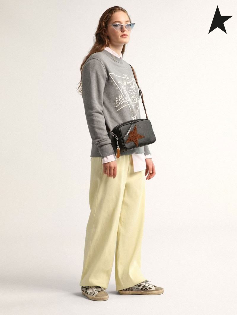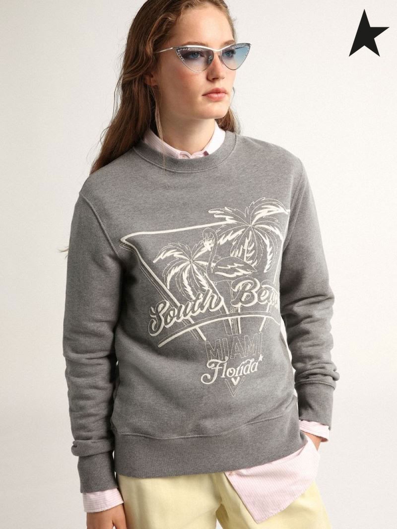 أوزة ذهبية اللون الرمادي رحلة جمع البلوز مع النخيل طباعة الشاطئ الجنوبي حروف باللون الأبيض الرمادي
