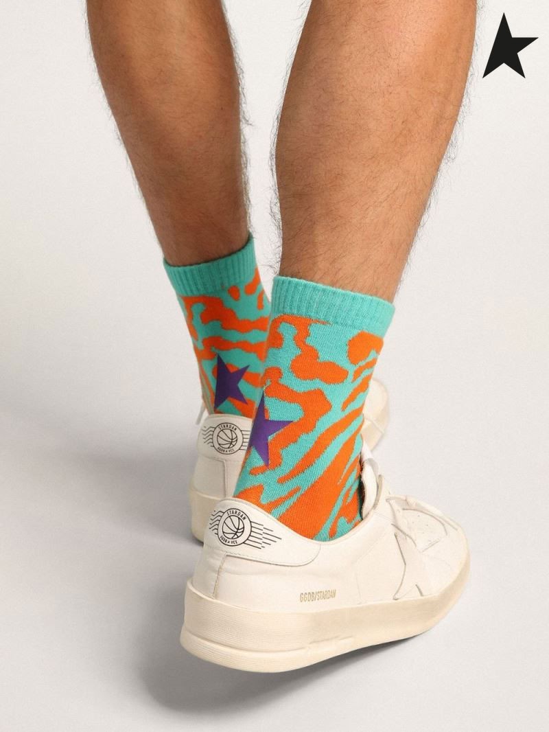 Zlatá Husa Tyrkysové, oranžové a fialové ponožky s leopard a zebra tisk a fialové hvězdy na zadní tyrkysová fialová oranžová