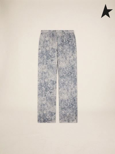 Golden Goose Evan Golden Resort Capsule collection linen pants in vintage blue with contrasting white toile de jouy print blue
