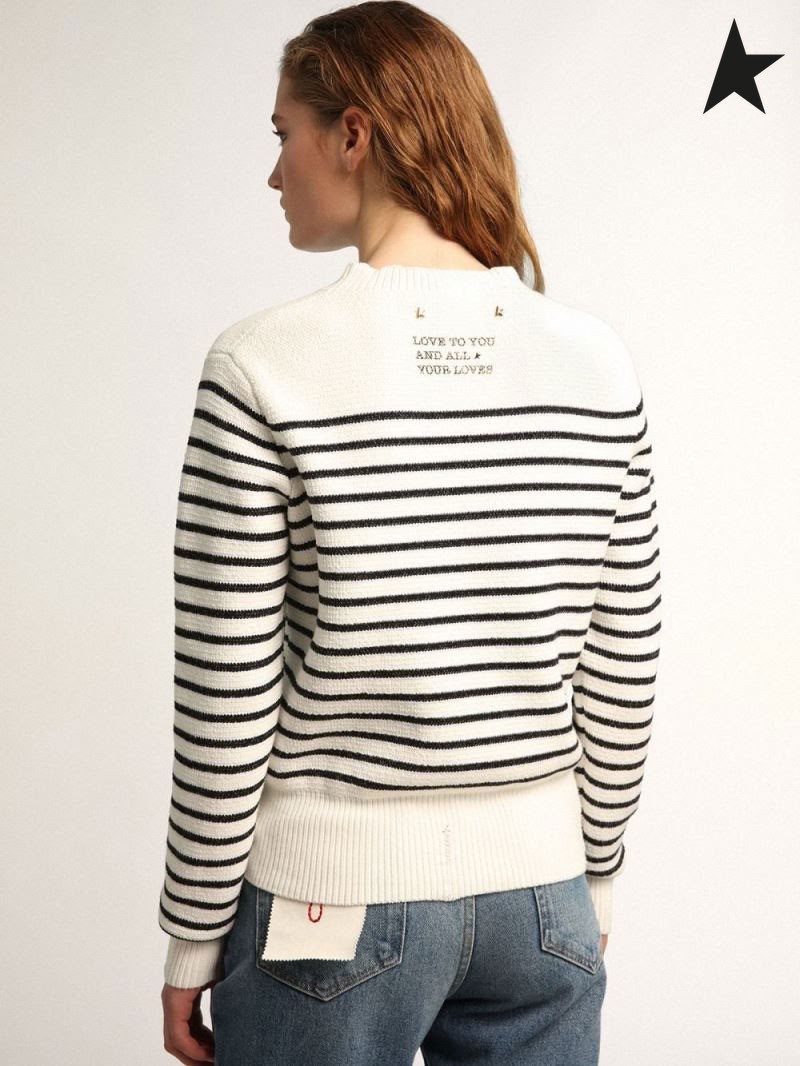 Golden Goose Λευκό Ταξίδι συλλογή πουλόβερ με ρίγες μπλε, αναξιοπαθούντα φινίρισμα και εγγραφή στο κολάρο λευκό