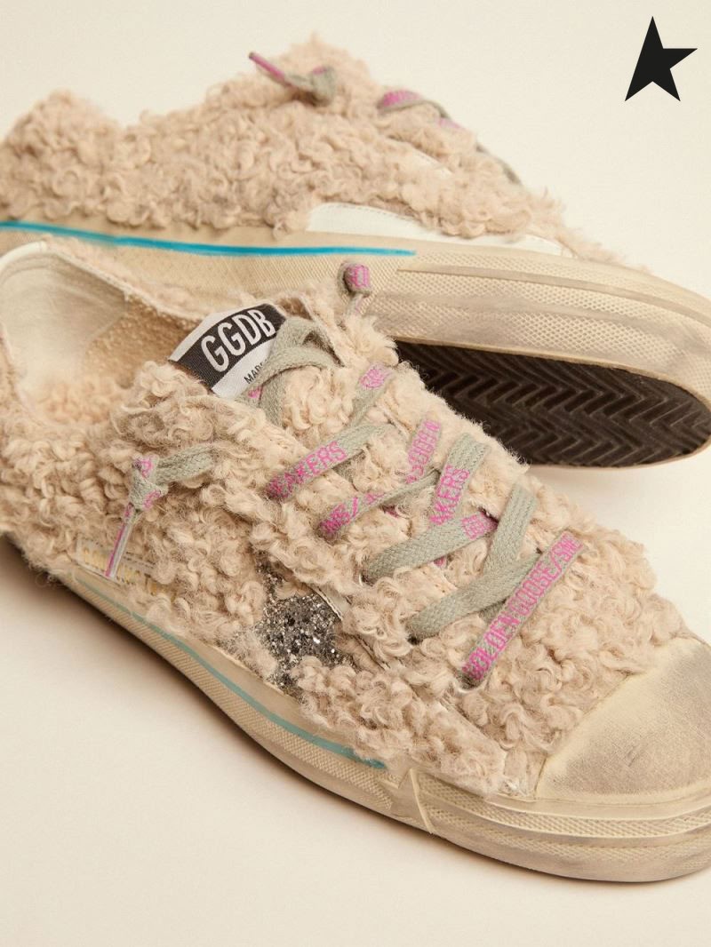 Golden Goose Beige shearling-effect V-Star LTD sneakers with silver glitter star silver white gray