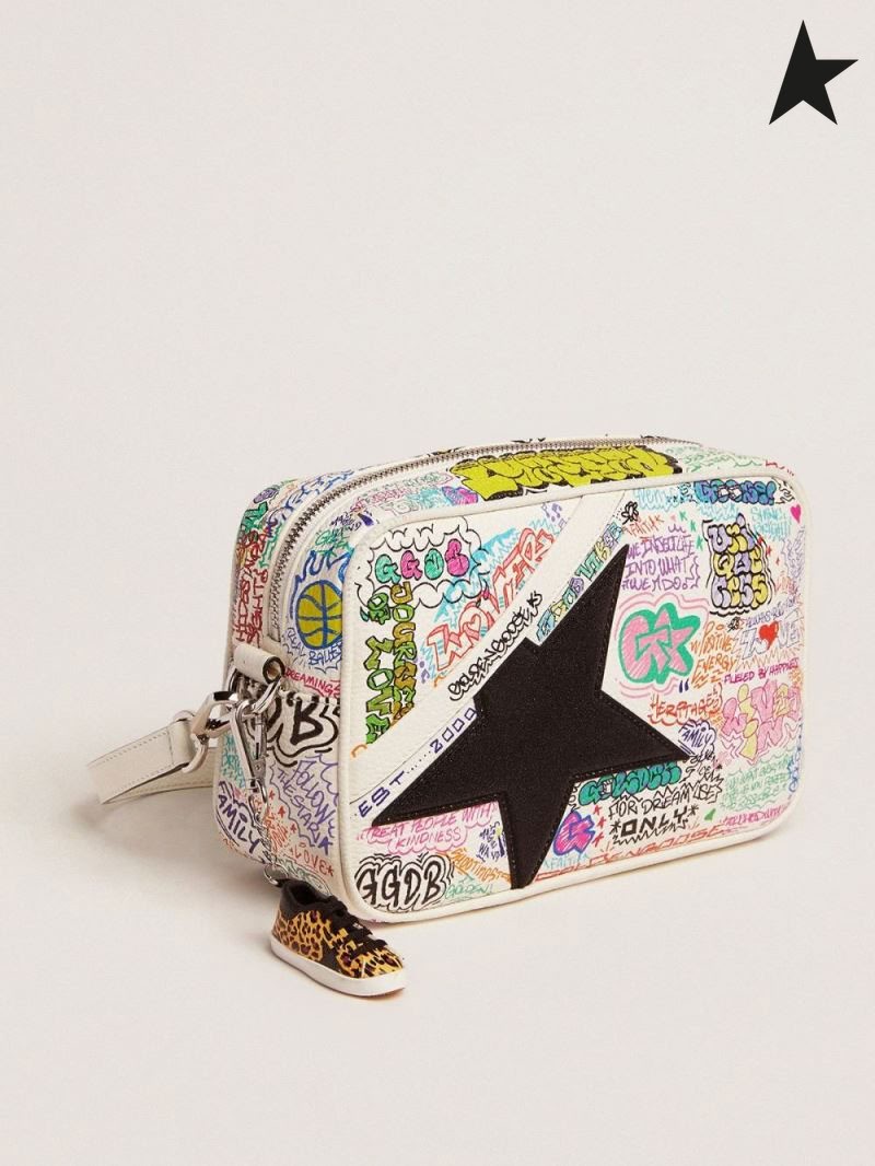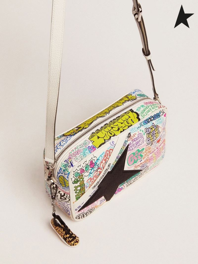 Golden Goose Star Bag with graffiti print and black glitter star white