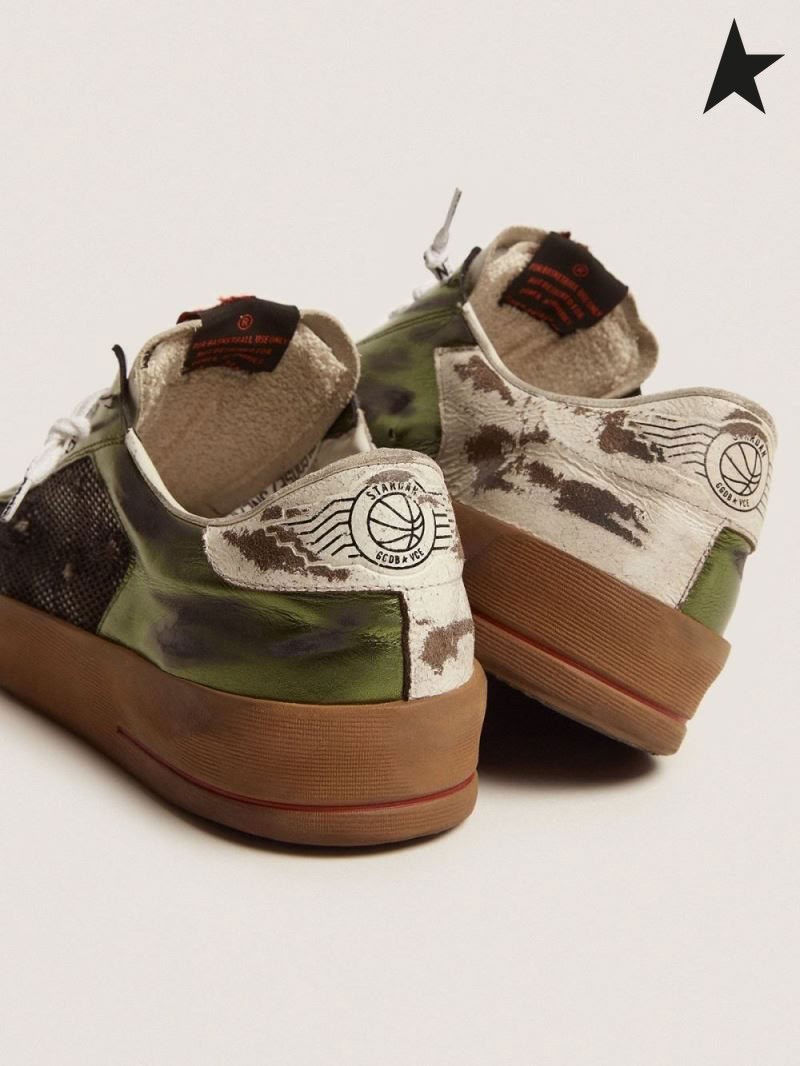 Golden Goose Stardan LAB sneakers with dark green pony skin upper and white crackle leather heel tab dark green white