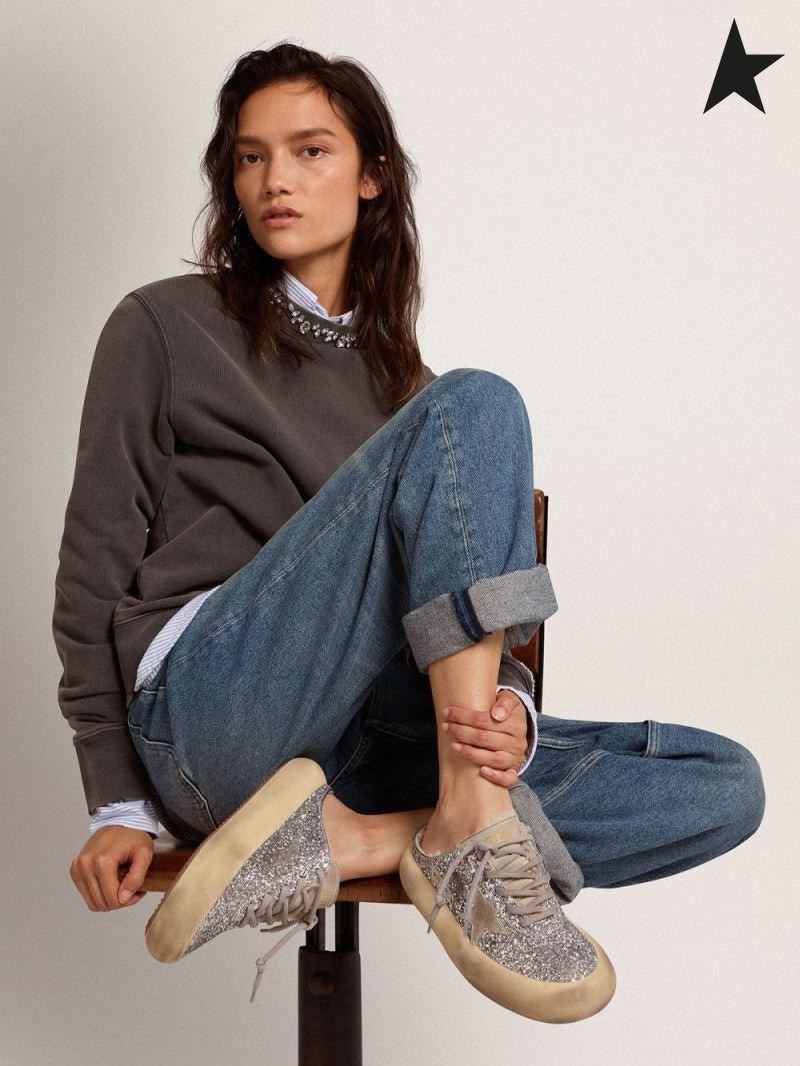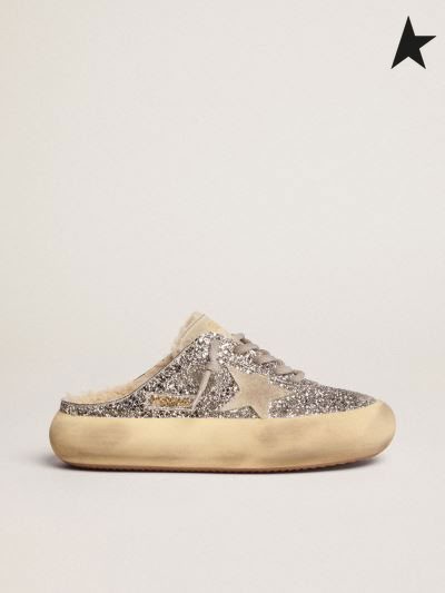 Golden Goose Espacio-Star Sabot zapatillas en el brillo de plata con forro de piel de oveja de plata gris gris gris