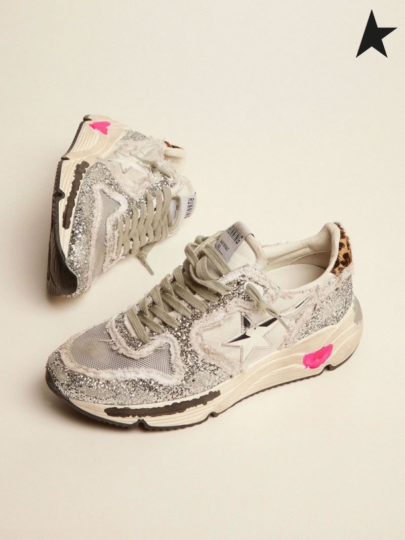 Golden Goose lenkkitossut Pohja lenkkarit nylon ja hopea glitter leopard-print poni iho kantapää välilehti hopea leopard