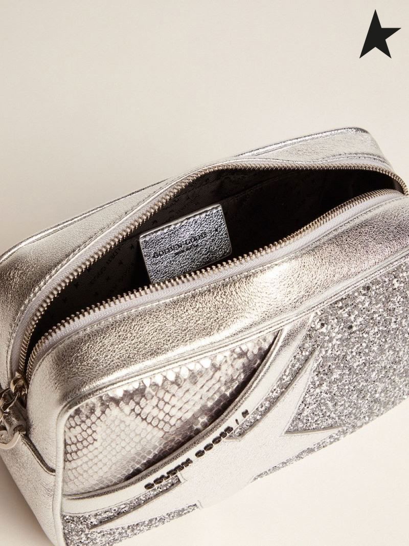 Golden Goose Tähden Laukku on valmistettu silver snake-print nahka ja kimalle Käärmeennahka