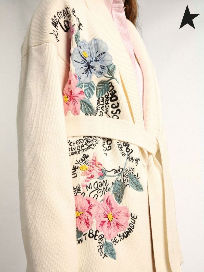 Golden Goose Valkoinen Journey collection neuletakki fringed helma, vyö ja käsin kirjonta Beige valkoinen
