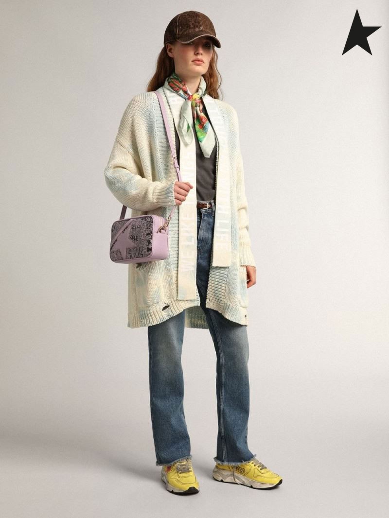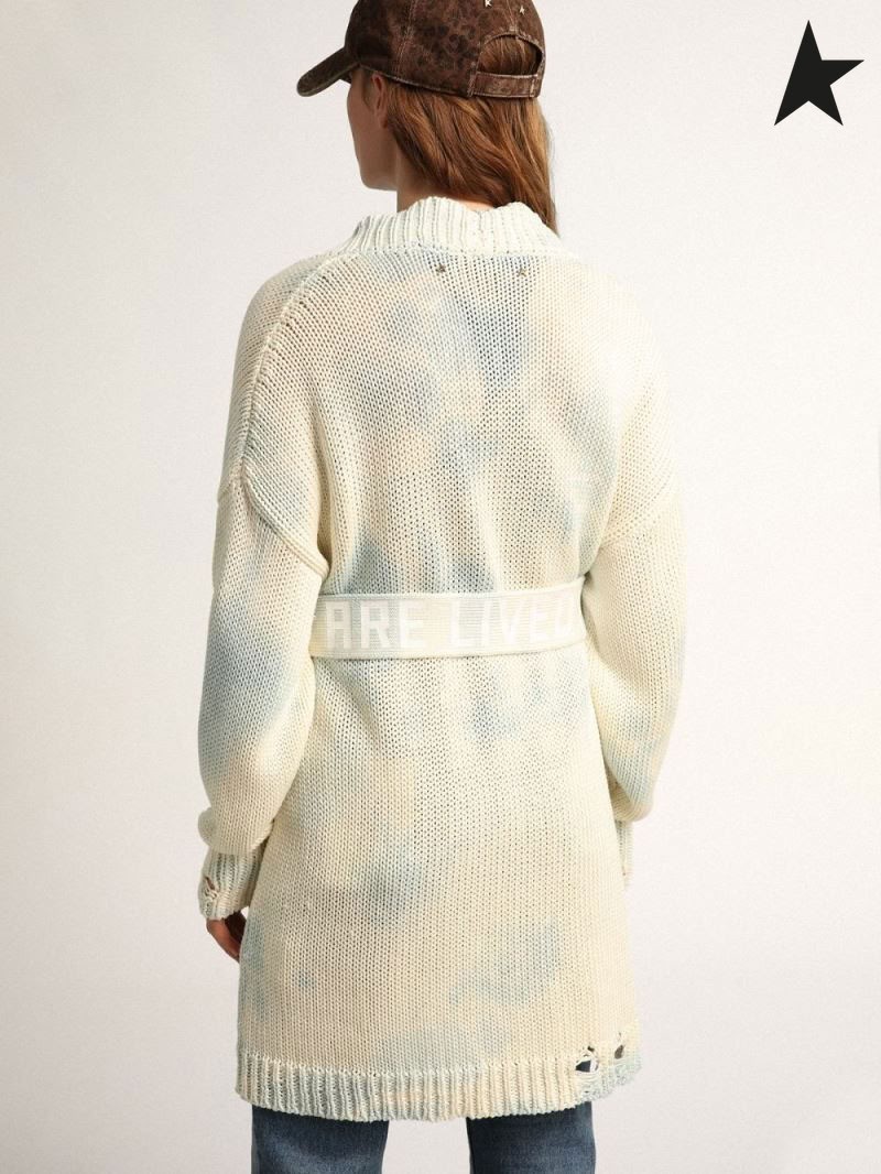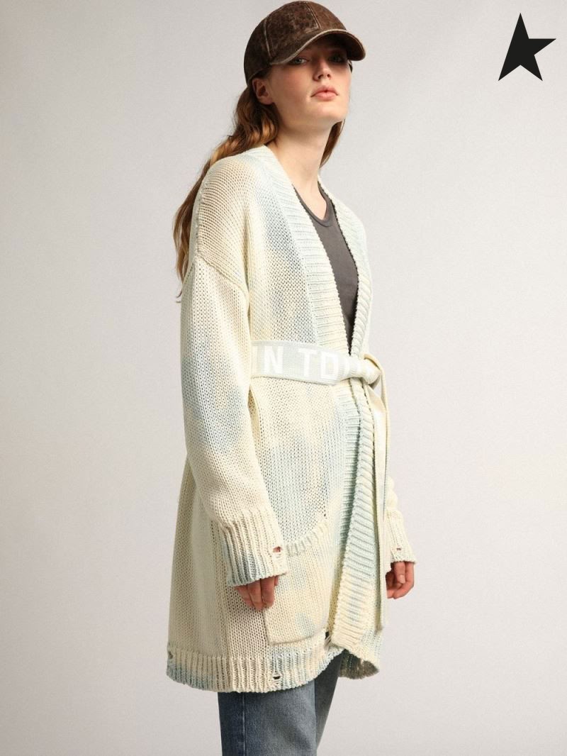 Golden Goose Blanc vieilli-finition Voyage collection cardigan avec de la poudre bleu-effet tie and dye et le lettrage blanc sur la bordure blanc bleu