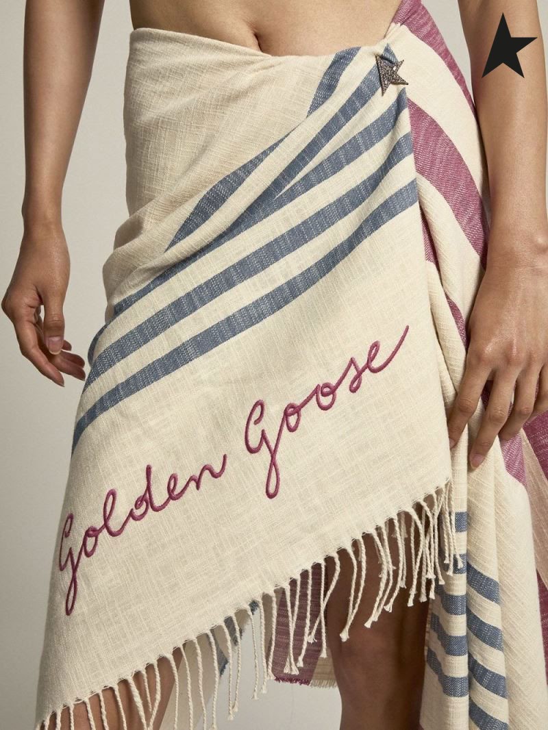 Golden Goose Egeo Golden Resort collection Capsule de coton serviette de plage vintage rouge sur fond blanc et rayures bleues et tressé des franges au bas blanc