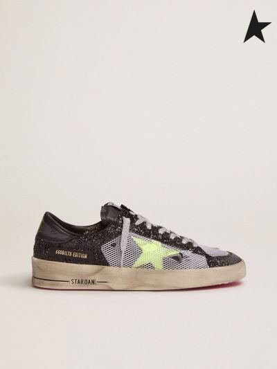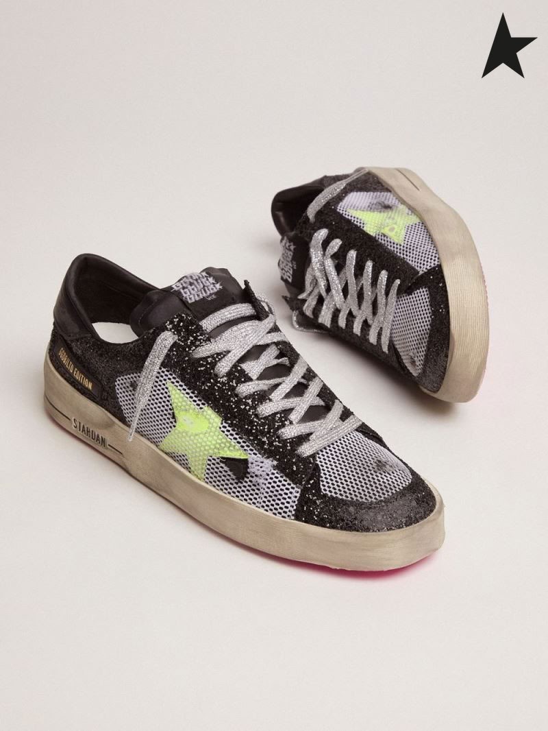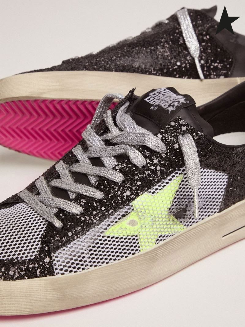 Golden Goose Stardan baskets à paillettes supérieure, jaune fluo étoiles et inserts en mesh marron jaune fluo