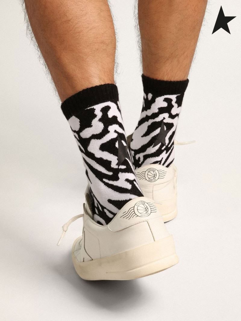 Gé órga Dubh agus stocaí bána le cló liopard agus dubh réalta ar chúl Dubh bán