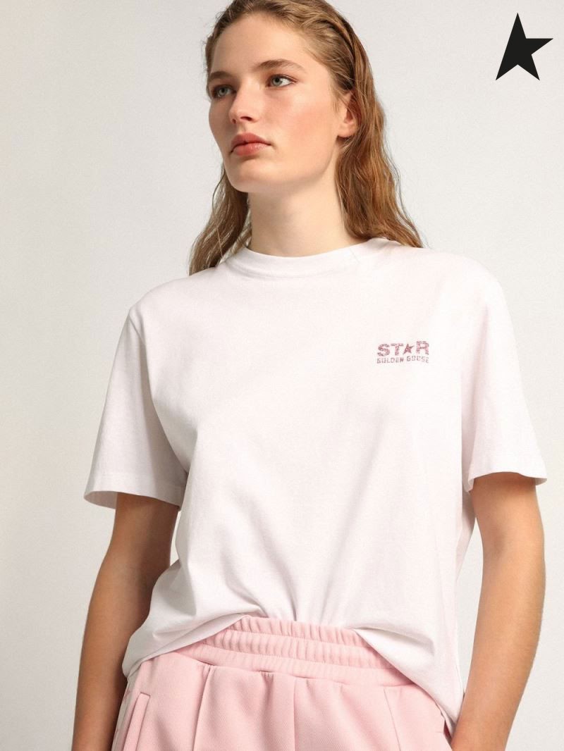 Órga Gé Bán Star bailiúchán T-léine le lógó agus réalta i glitter pink bán