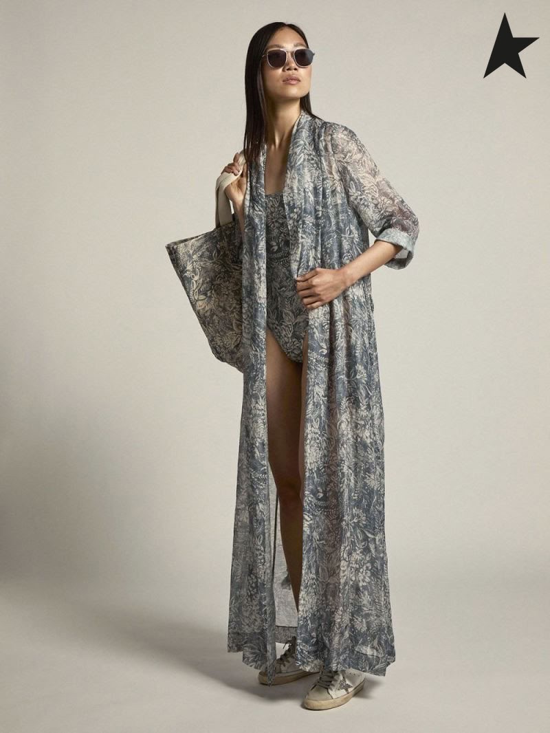 Órga Gé Esmeralda Órga Rogha Capsule bailiúchán línéadach caftan i vintage gorm le bán i gcodarsnacht toile de jouy priontáil gorm