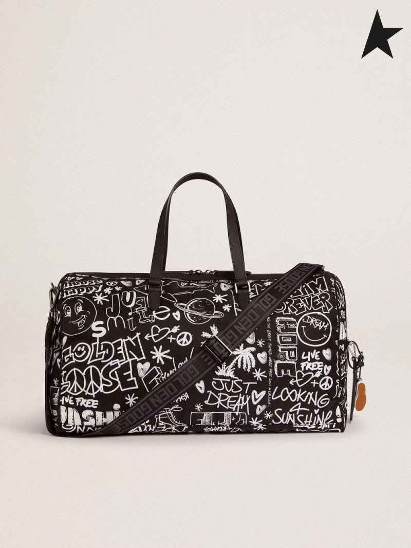 Órga Gé Thuras duffle mála i dubh níolón le gcodarsnacht bán maisiúcháin