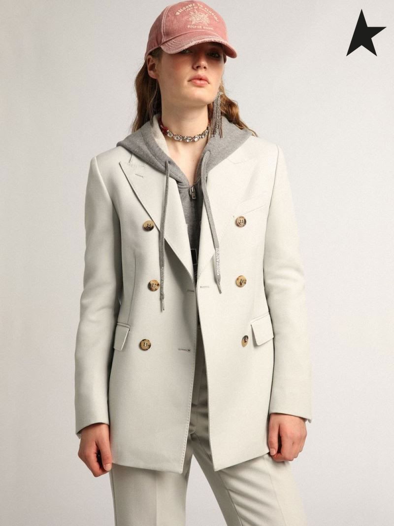 Órga Gé Turas bailiúchán aonair-breasted blazer i pastail buí le jewel cnaipí agus bioráin gorm