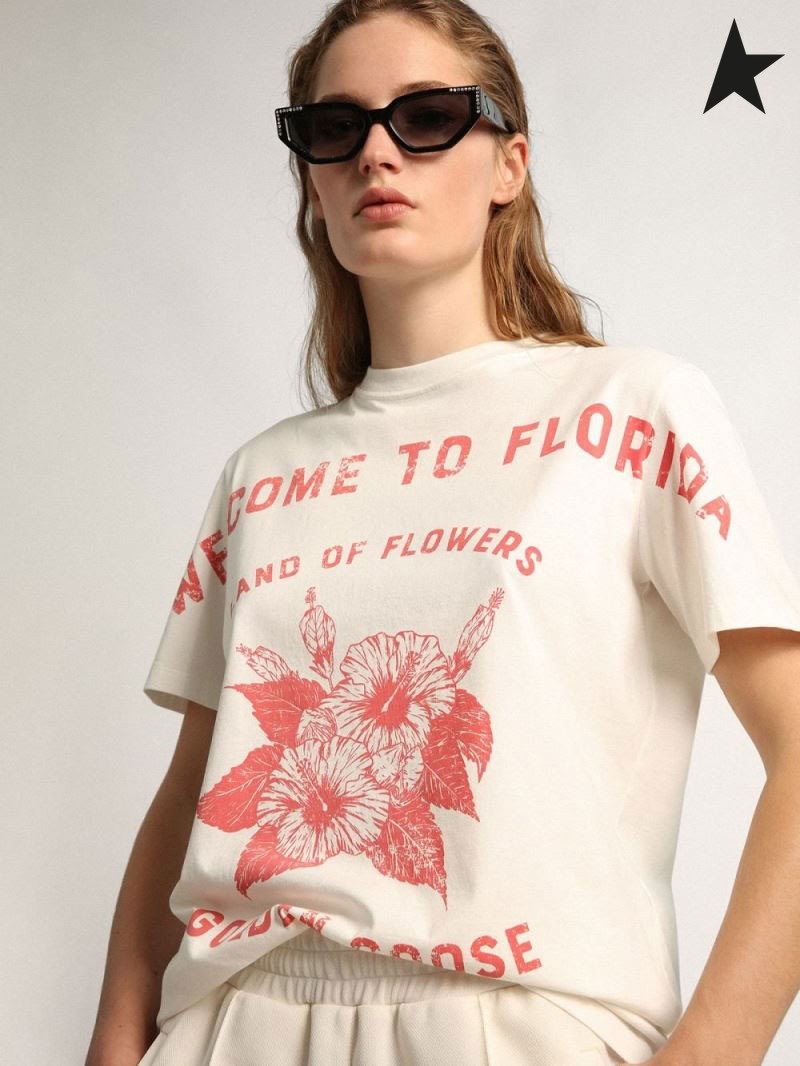 T-shirt Golden Goose White Journey collection s cvjetnim po cijeloj površini i oznakom crveno-bijele boje