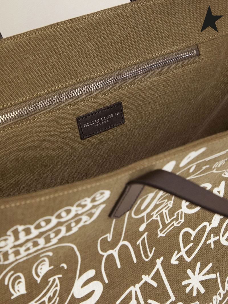 Golden Goose East-West California Bag in military green canvas with graffiti coffee