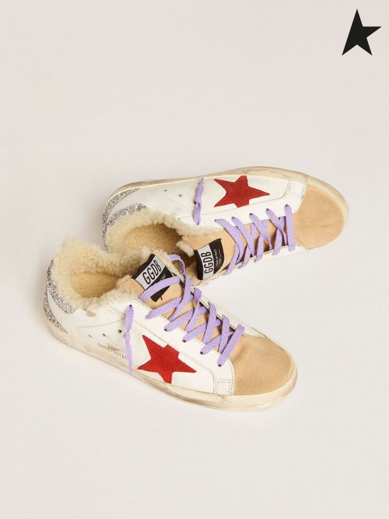 Golden Goose Szuper Csillagos cipők shearling bélés, vörös velúr csillag fehér