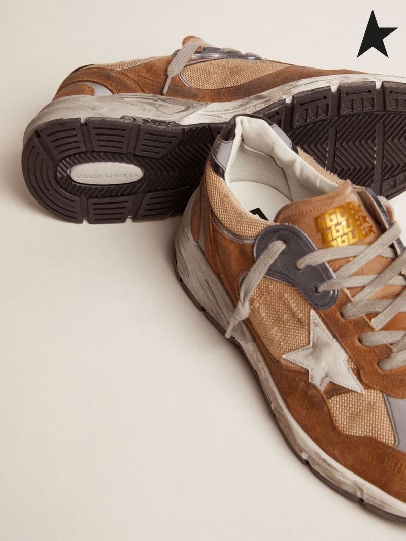 Golden Goose Papà-Star sneakers tabacco colorata in mesh e pelle scamosciata in pelle bianca, stella e pelle nera scheda di tacco rosso bianco nero