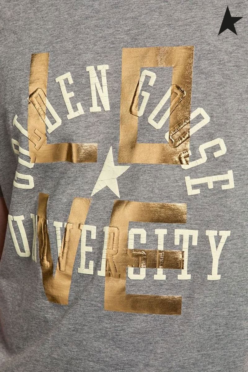 황금알을 낳는 거위 회색 멜란지 여행 컬렉션 T-셔츠와 금 문자와 흰 로고 회색