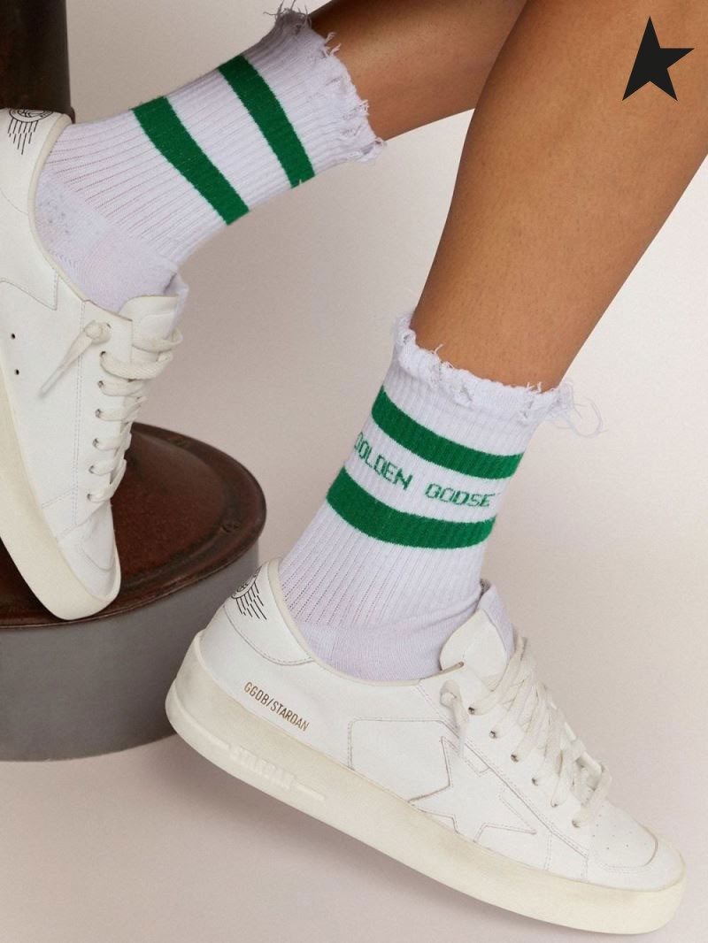 Golden Goose bomull sokker med slitte kanter, grønne striper og Gyllen Goose logo brun grønn grønn