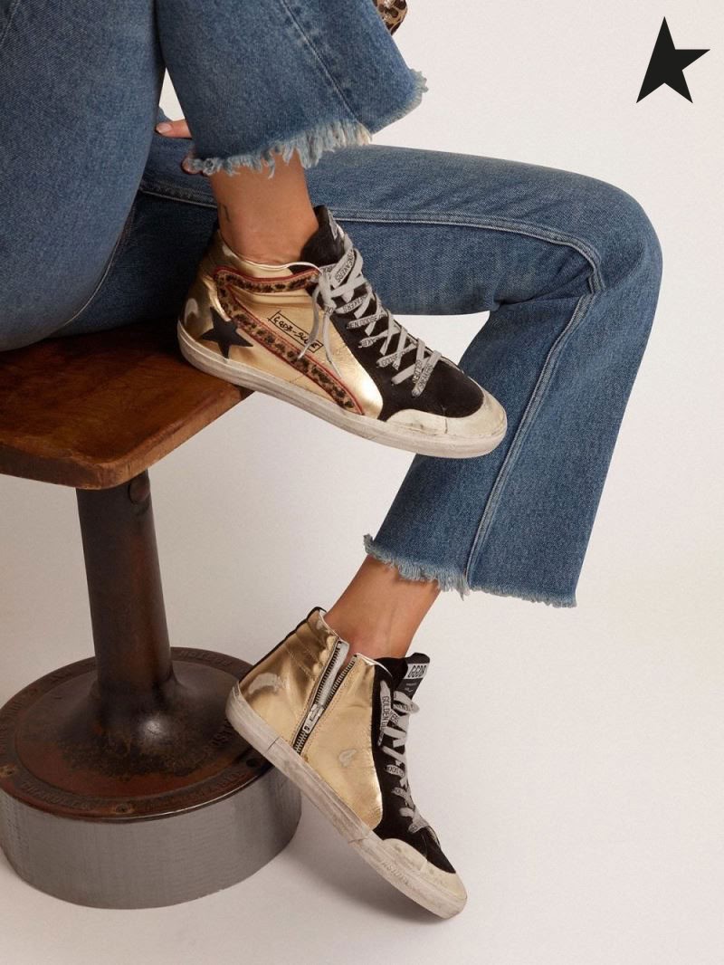 Golden Goose Penstar joggesko i gull skinn med sort skinn stjerne og leopard-print ponni huden sett gull farge svart svart