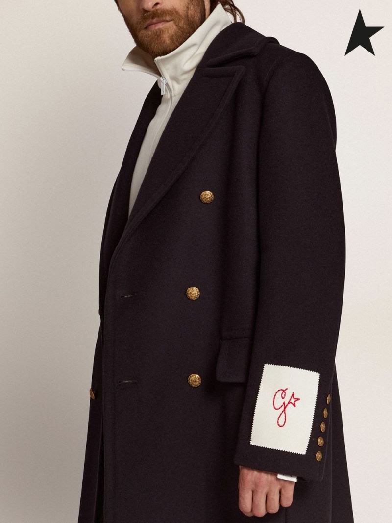 Dwurzędowy płaszcz Golden Goose Golden collection z ciemno-niebieskiej wełny ze złotymi геральдическими guzikami w kolorze granatowym