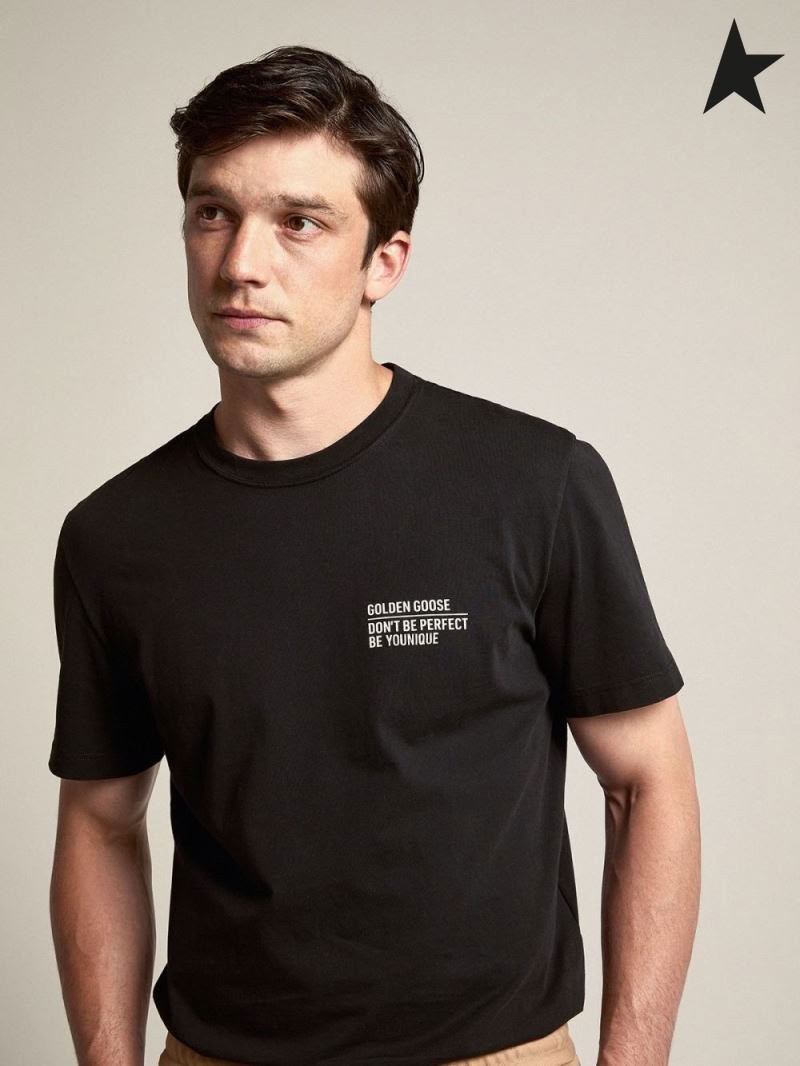 Koszulka Golden Goose Black Journey collection z kontrastowym białym logo i napisem z przodu w kolorze czarnym