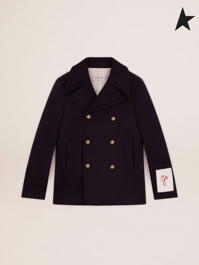 Krótki dwurzędowy płaszcz Golden Goose Golden collection z ciemno-niebieskiej wełny ze złotymi геральдическими guzikami w kolorze granatowym