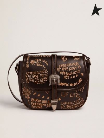 Torba na rodeo Golden Goose średniej wielkości z czarnej skóry z kontrastowym czarnym nadrukiem