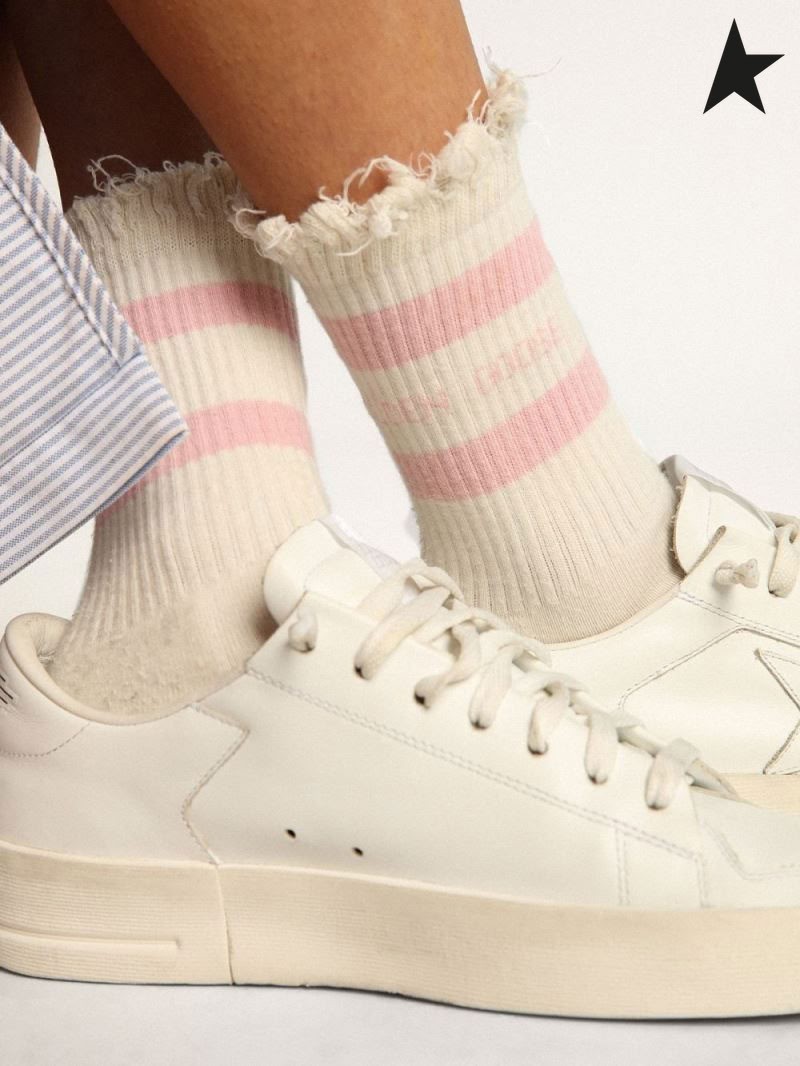Ganso de ouro Angustiado-acabamento de meias brancas com o bebê-rosa listras e o logotipo branco