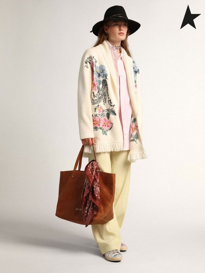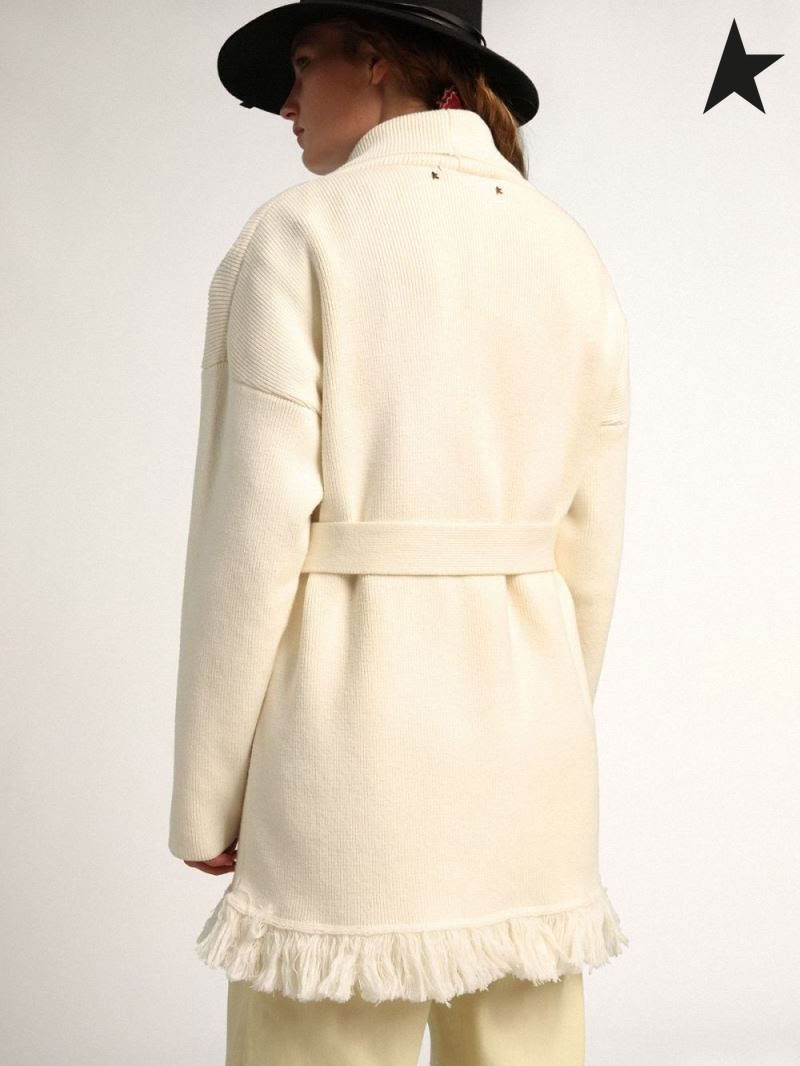 Ganso de ouro Branco Jornada de recolha de casaquinho com franja bainha, cinto na cintura e bordado à mão branco sujo