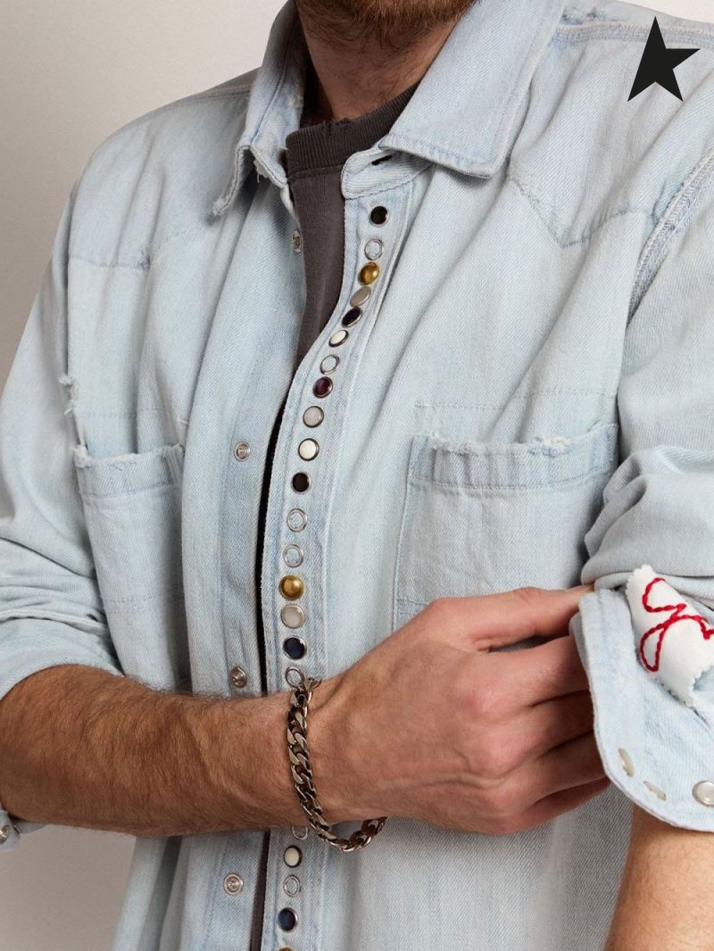 Ganso de ouro coleção de Ouro branqueada camisa jeans com pregos martelados azul