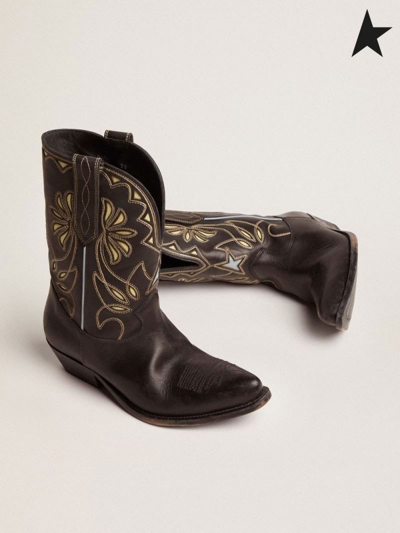 Ganso de ouro Desejo Star de salto baixo e botas de couro preto com amarelo-canário embutimento detalhes preto