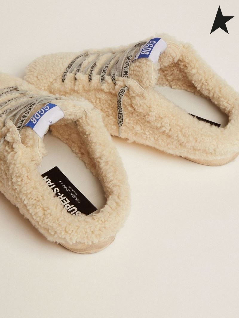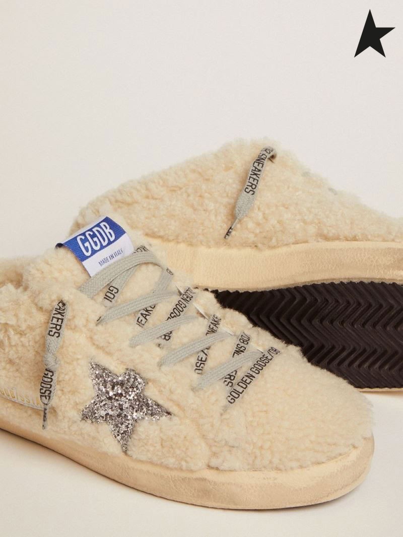 Gâsca de aur Super-Star Saboți Adidași în alb natural shearling cu sclipici argintiu star Beige alb gri argintiu