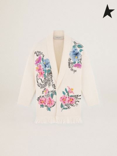 Zlatá Hus Biela Cesta zber cardigan s lemovaný lem, pás v páse a ručné výšivky Béžová biela