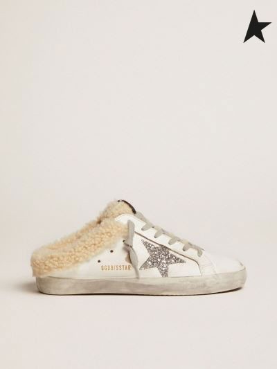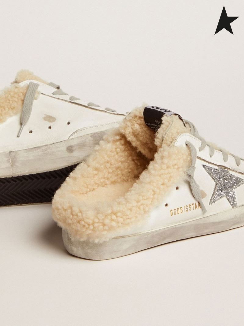 Zlatá Hus Super-Star Sabots v bielej kože s strieborný lesk star a shearling obklad biela