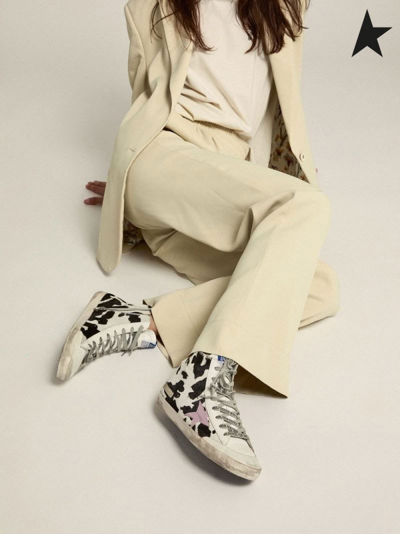 Golden Goose Francy Penstar sneakers i ko-print ponny hud med rosa och laminerat lackläder stjärniga svart vit