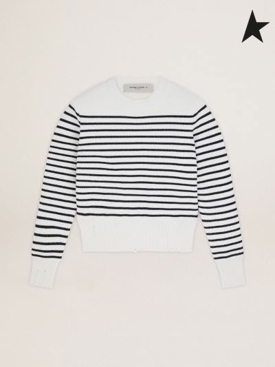 Golden Goose Vit Resa samling tröja med blå ränder, nödställda slut och bokstäver på vit krage