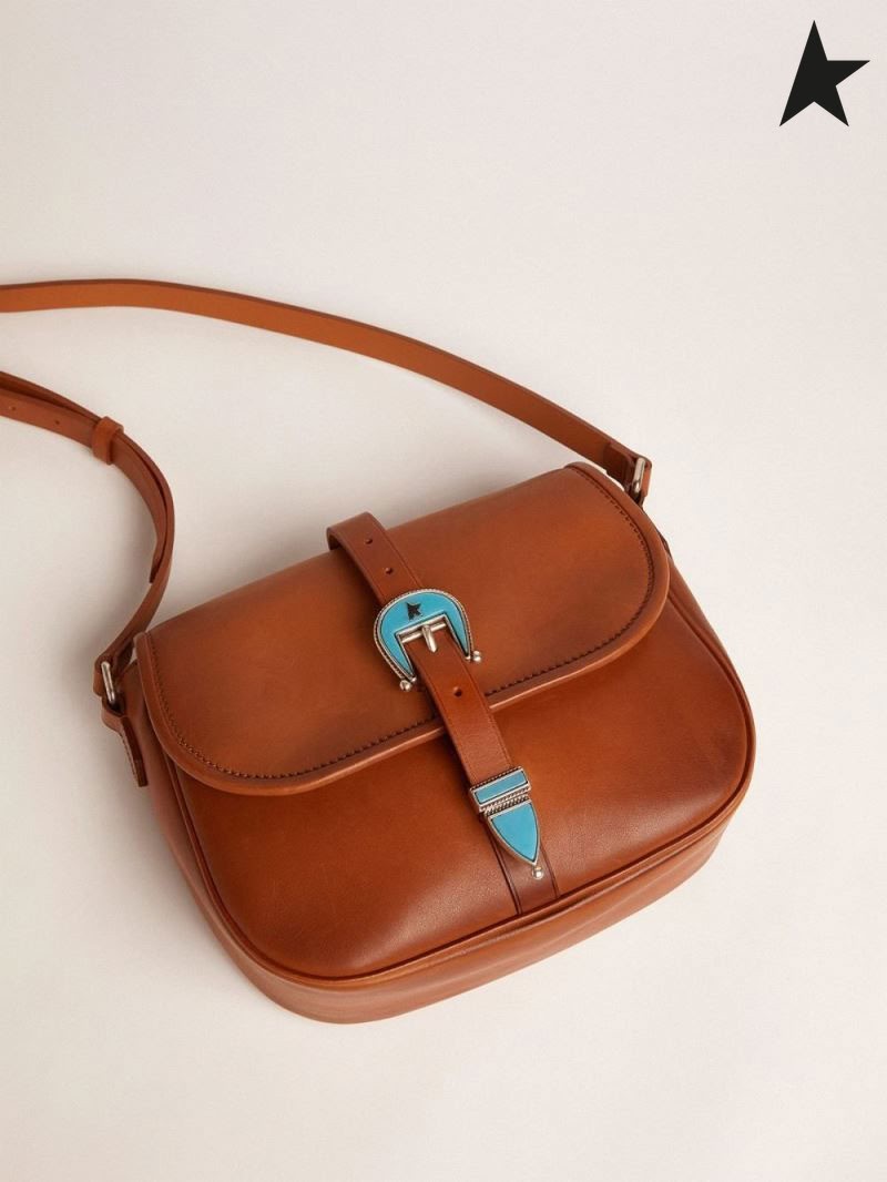 Açık mavi detaylı kahverengi ten rengi deriden Altın Kaz Orta Boy Rodeo çanta