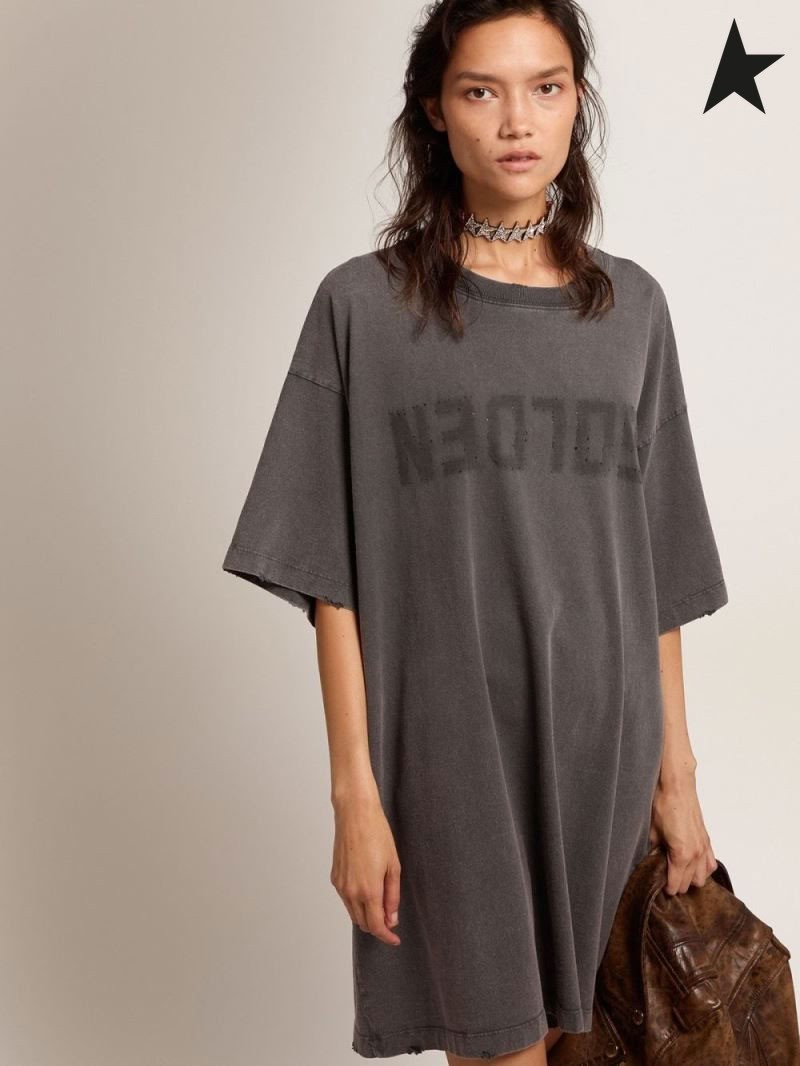 Altın Kaz Altın koleksiyon antrasit grisi sıkıntılı işlemeli tişört elbise koyu gri