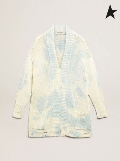 Altın Kaz Beyazı sıkıntılı bitişli Yolculuk koleksiyonu pudra mavisi batik efektli hırka ve kenarlarında beyaz mavi yazı