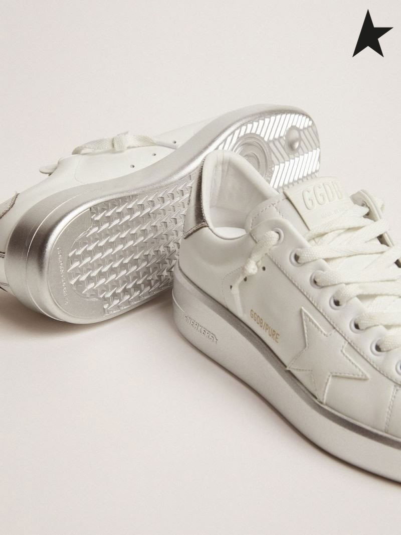 Altın Kaz Purestar spor ayakkabı beyaz deri, gümüş lamine topuk tırnaklı ve tilki beyazı gümüş