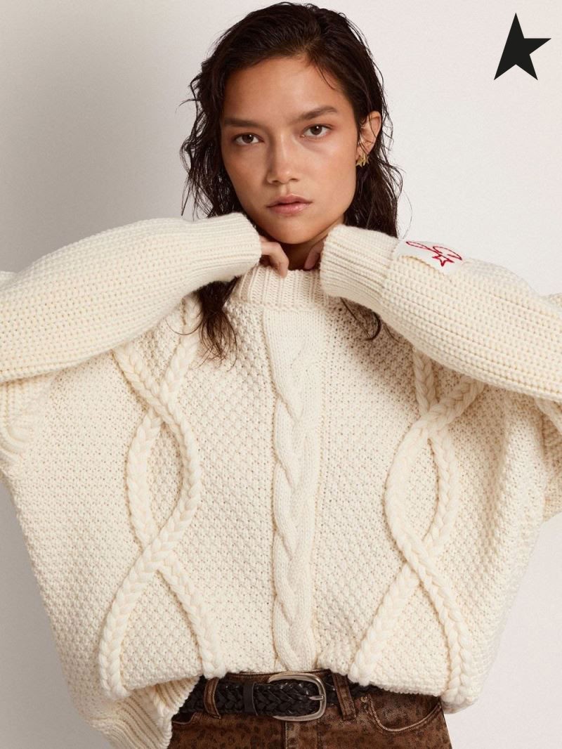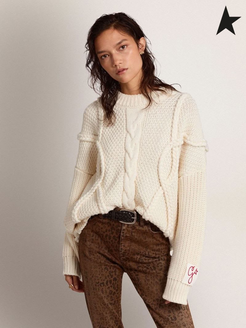Beyaz yün Bej beyaz altın Kaz yuvarlak yakalı kazak