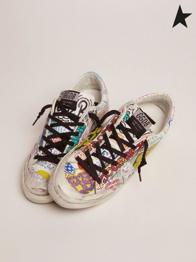 Çok renkli grafiti baskılı beyaz deriden altın Kaz Süper Yıldız spor ayakkabı beyaz kırmızı Çok renkli