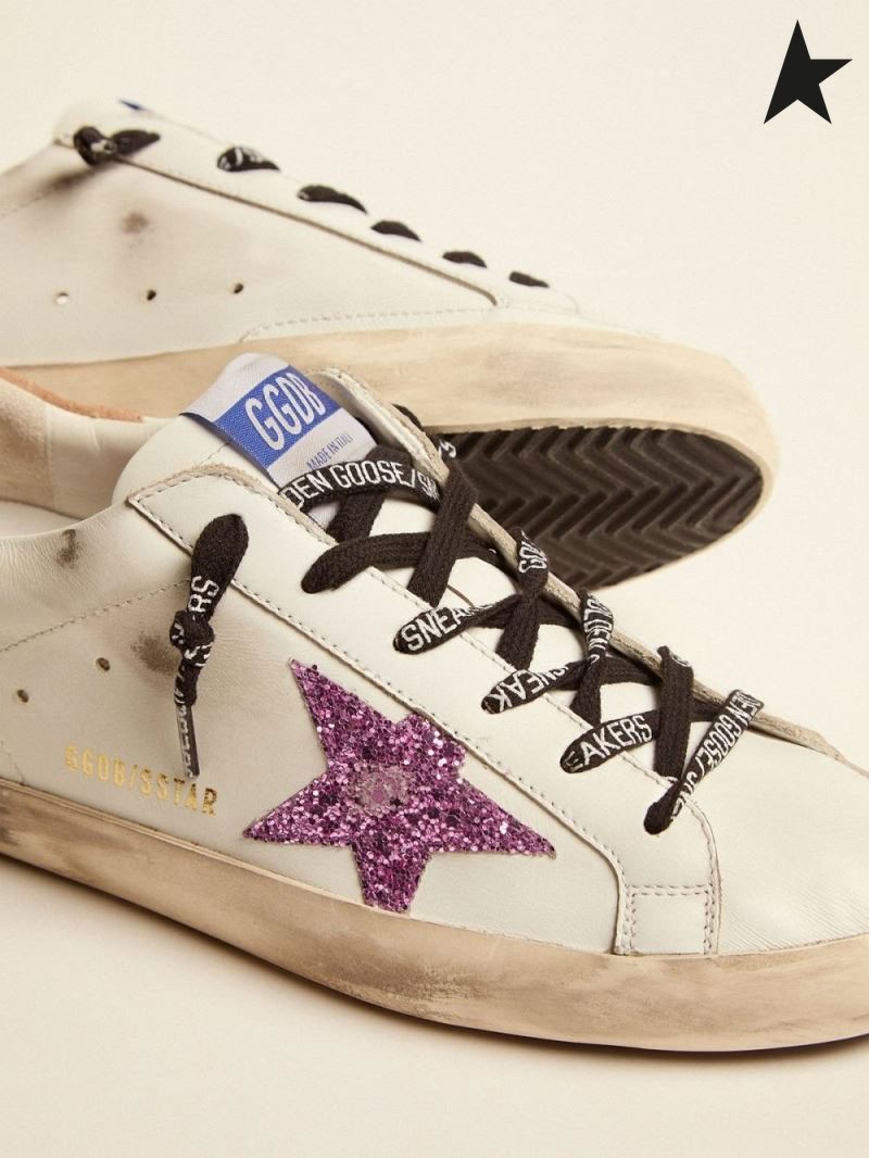 Lavanta rengi parıltılı yıldız beyazı ile beyaz deriden altın Kaz Süper Yıldız spor ayakkabı